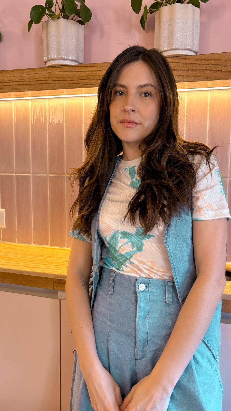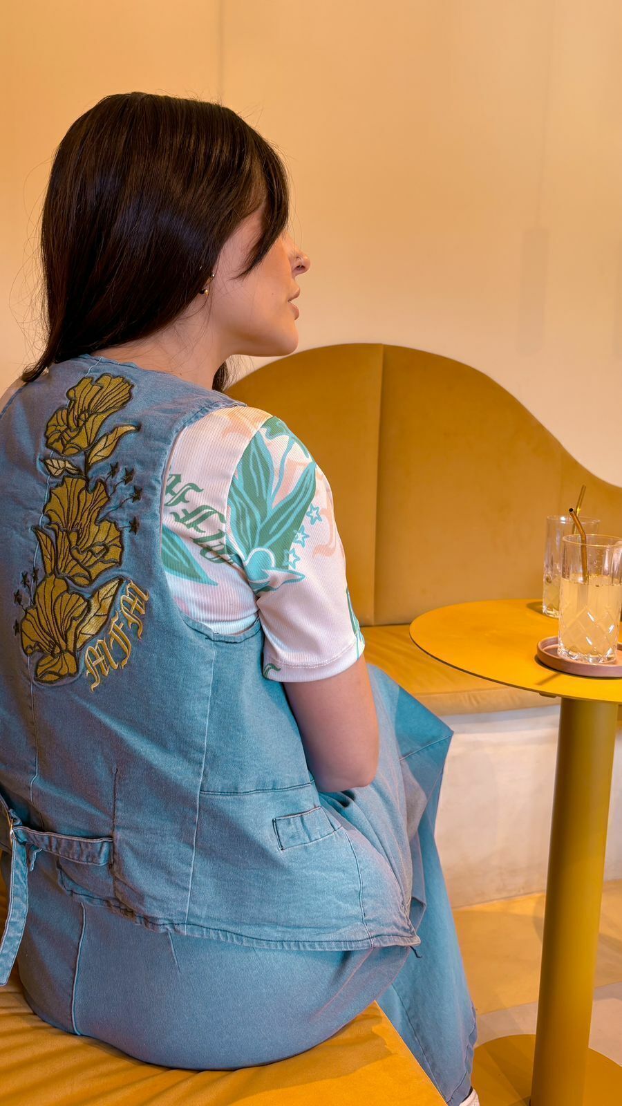Este chaleco de jean presenta un diseño único y personalizado de la marca, destacándose por un elegante bordado en la parte posterior. El bordado muestra flores estilizadas en tonos amarillos, acompañadas de estrellas y las iniciales "MFM" en un estilo de letra gótica. El interior del chaleco está forrado con popelina de algodón, lo que proporciona suavidad y comodidad. Este detalle de forrado hace que la prenda sea no solo estilosa, sino también agradable al contacto con la piel.