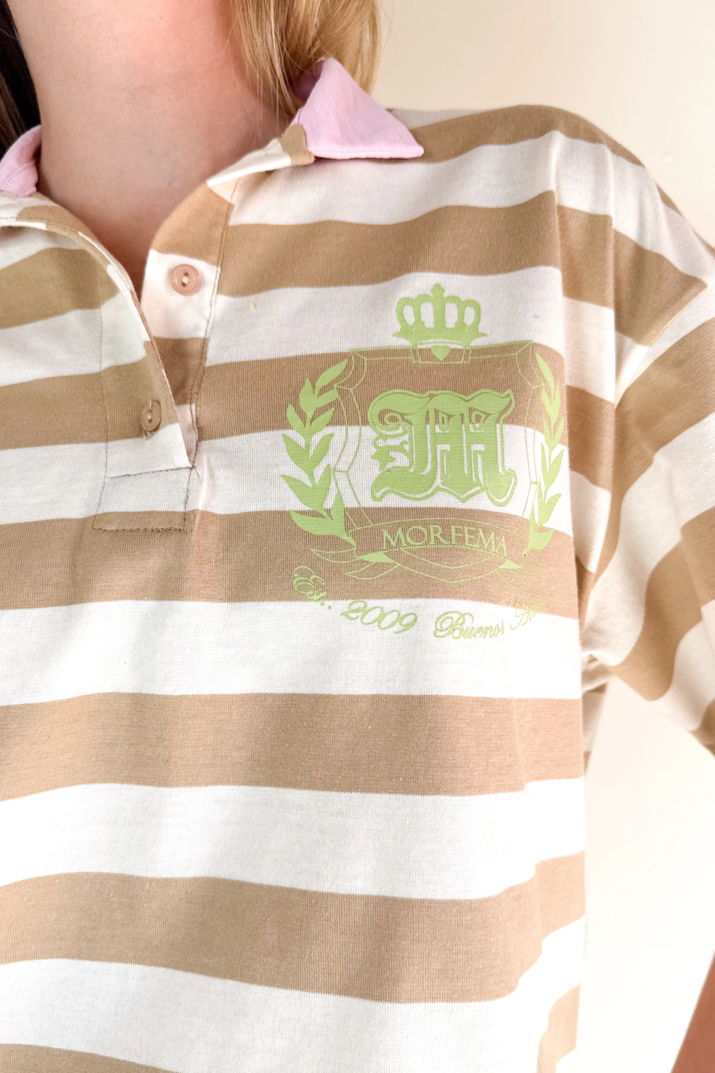 Chomba de jersey rayado con cuello de cey a contratono, mientras que la estampa única en la parte delantera destaca por su vibrante colorido. Cuenta con botones para facilitar su acceso y terminaciones calidad, garantizando durabilidad y buen acabado.