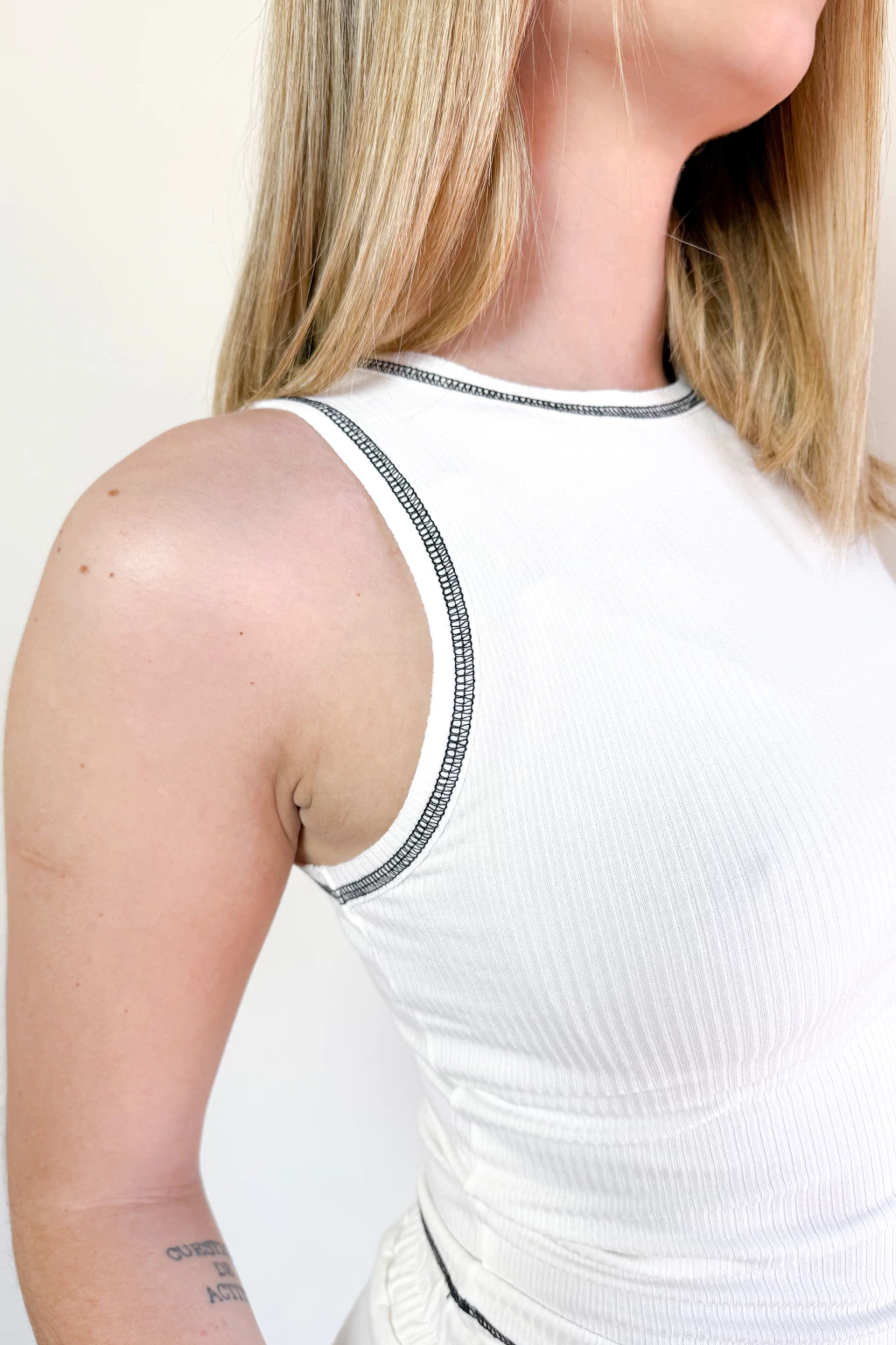 Musculosa Cairo Negra confeccionada en suave morley de algodón, su diseño se realza con un delicado bordado de collareta a contratono en el borde del escote y la sisa, aportando un detalle distintivo.