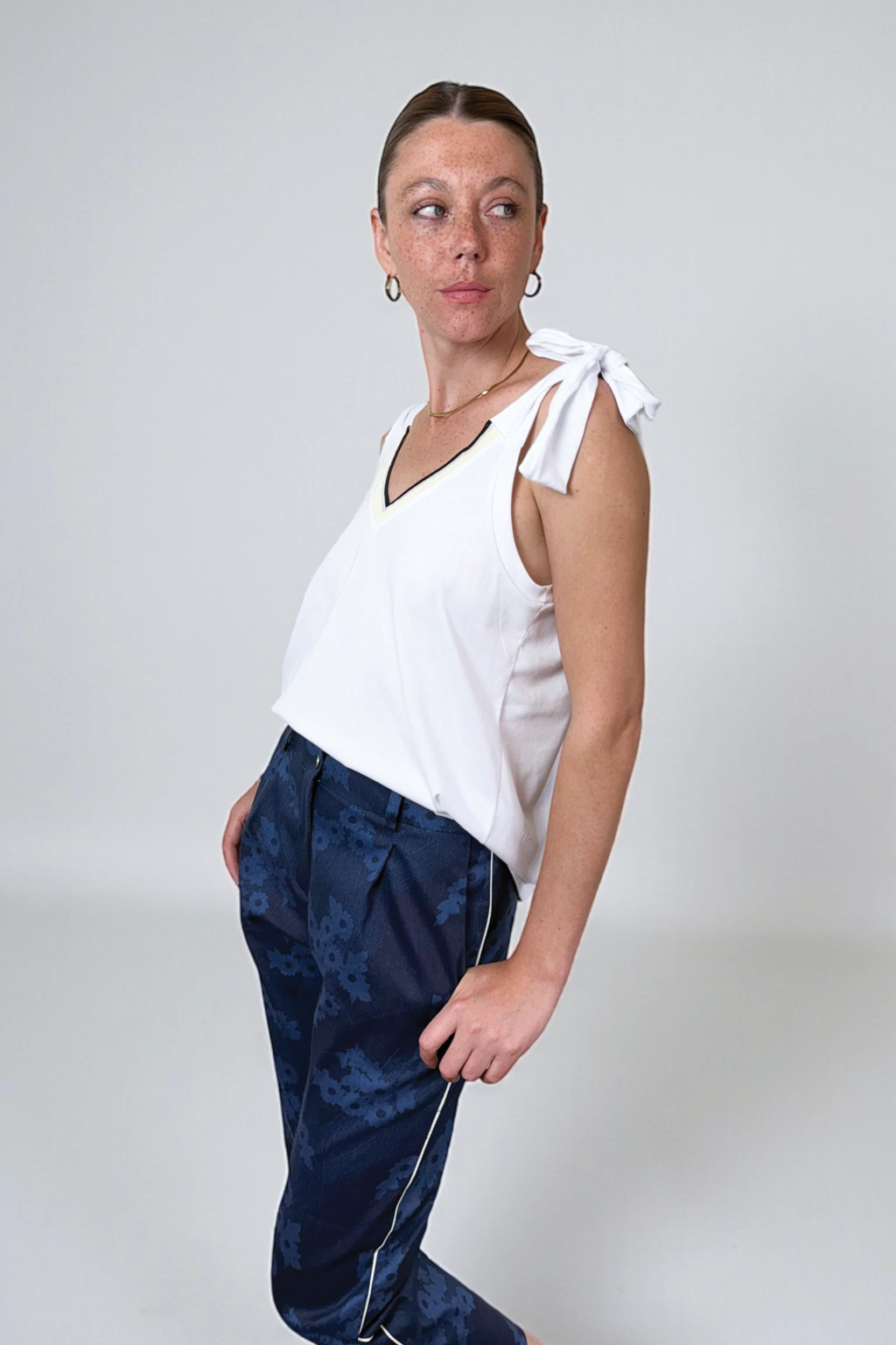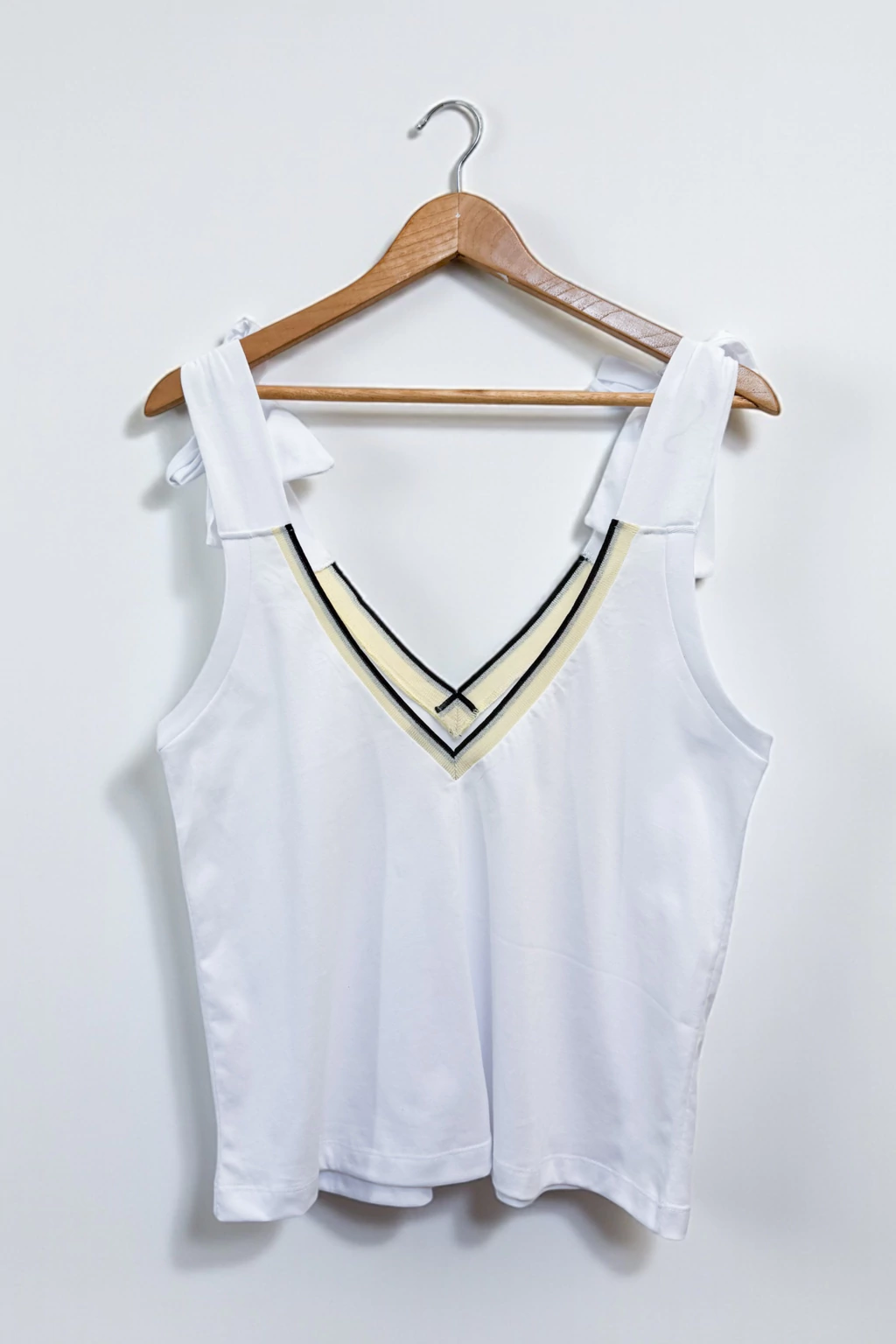 Musculosa de jersey de algodón, con lazo en los hombros y escote en “V” tejido a contratono con detalle en lurex que aporta un toque sutil de brillo. Su diseño incluye espalda descubierta, brindando un estilo fresco y moderno ideal para los días de verano.