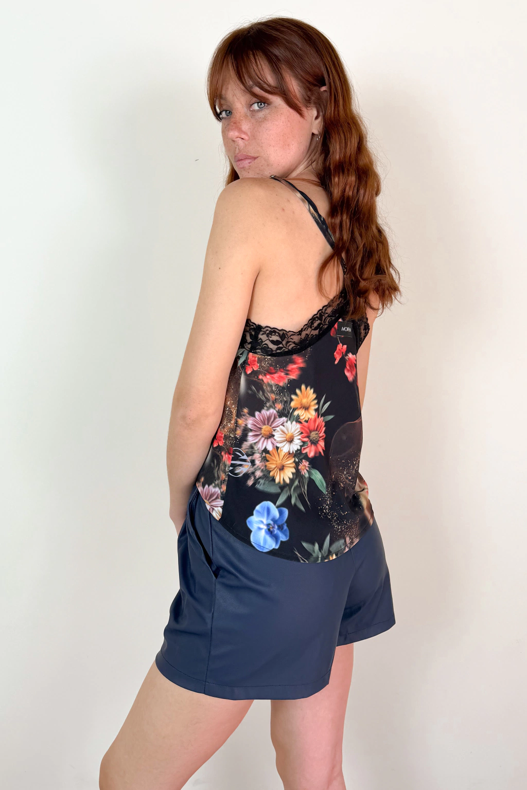 Musculosa de creppe estampado con detalle de puntilla elastizada en todo el borde. Posee tiritas de bretel regulables y estampado exclusivo de la marca.