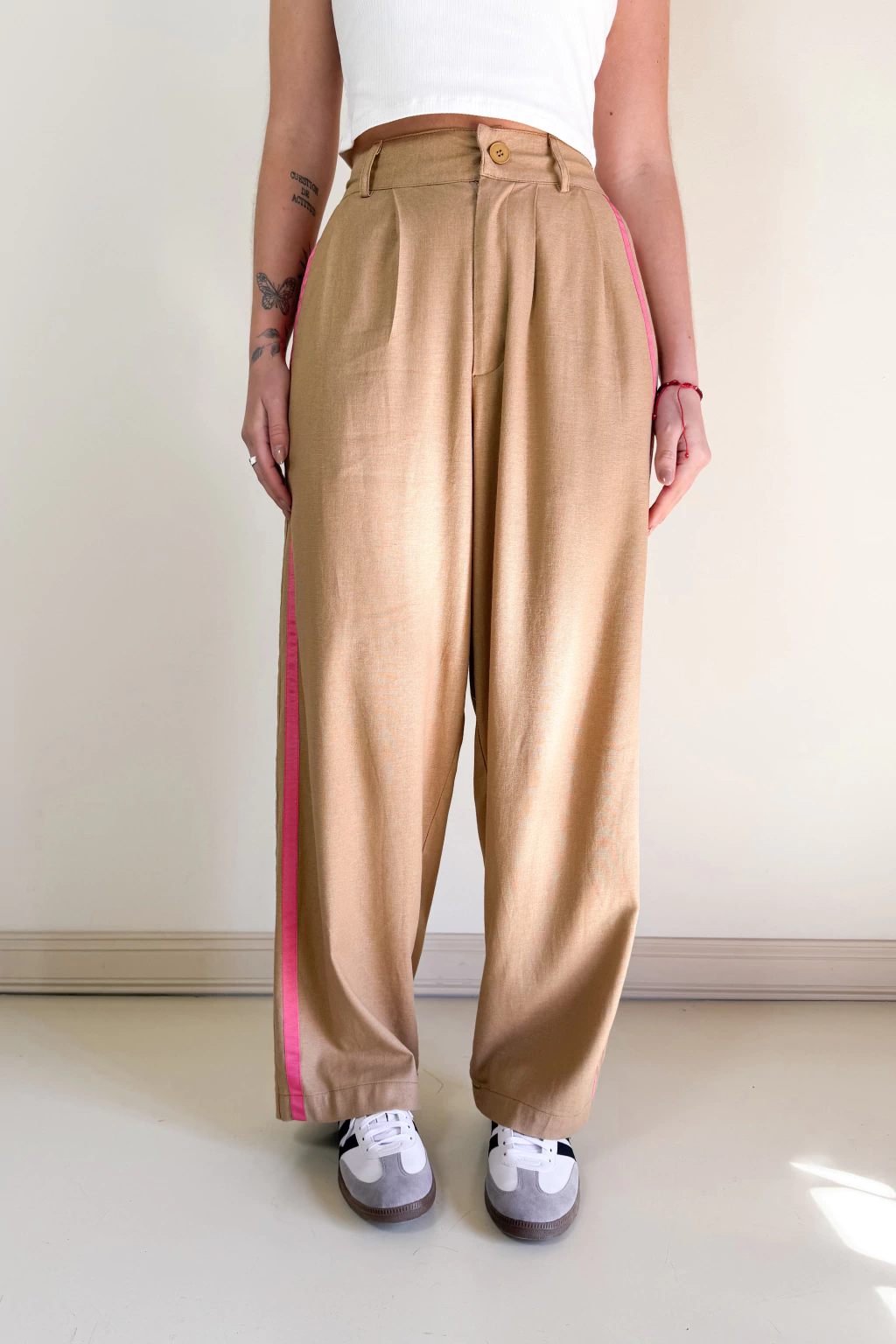 Pantalón Genova de lino con corte sastrero que cuenta con pinzas y cintura cambrada que realzan la figura, además de un elástico en la cintura trasera para un ajuste perfecto. Sus cintas gross laterales en contraste agregan un detalle distintivo.