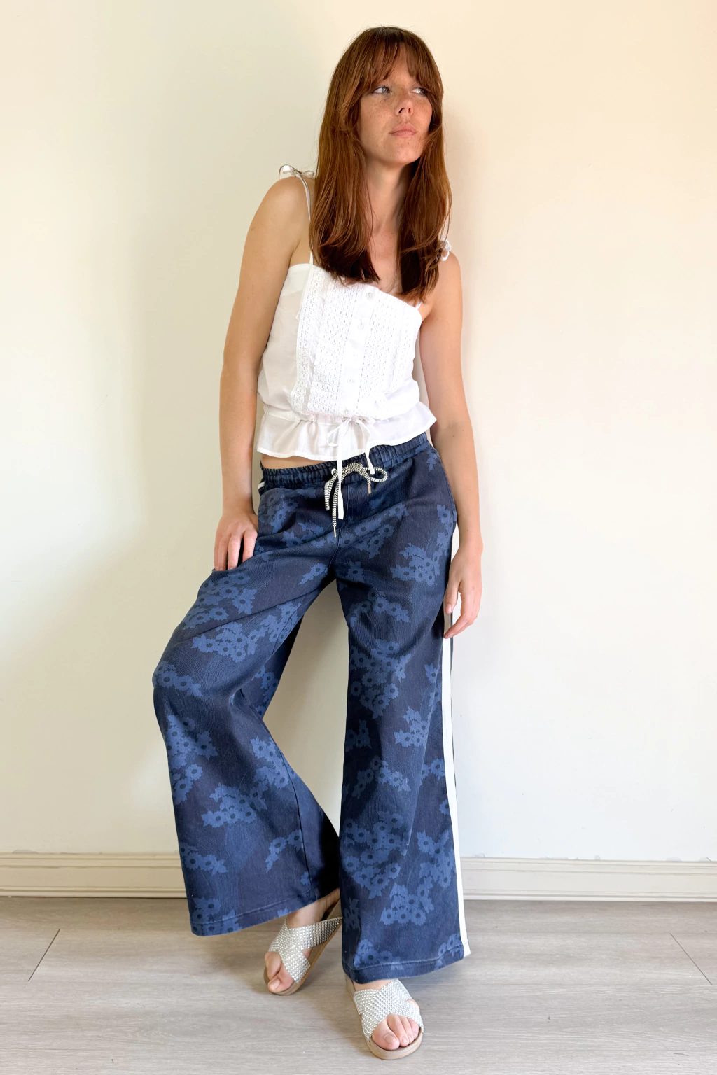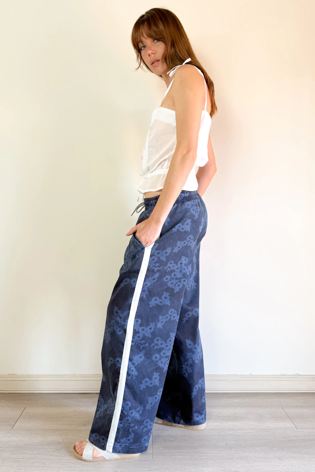 Pantalón Roma Azul de jean liviano con elastano y diseño exclusivo que incluye un delicado dibujo grabado a láser, acompañado por una tira de algodón con detalles lurex que realzan los laterales. Además, su cintura con cordón regulable asegura un ajuste perfecto para vos.