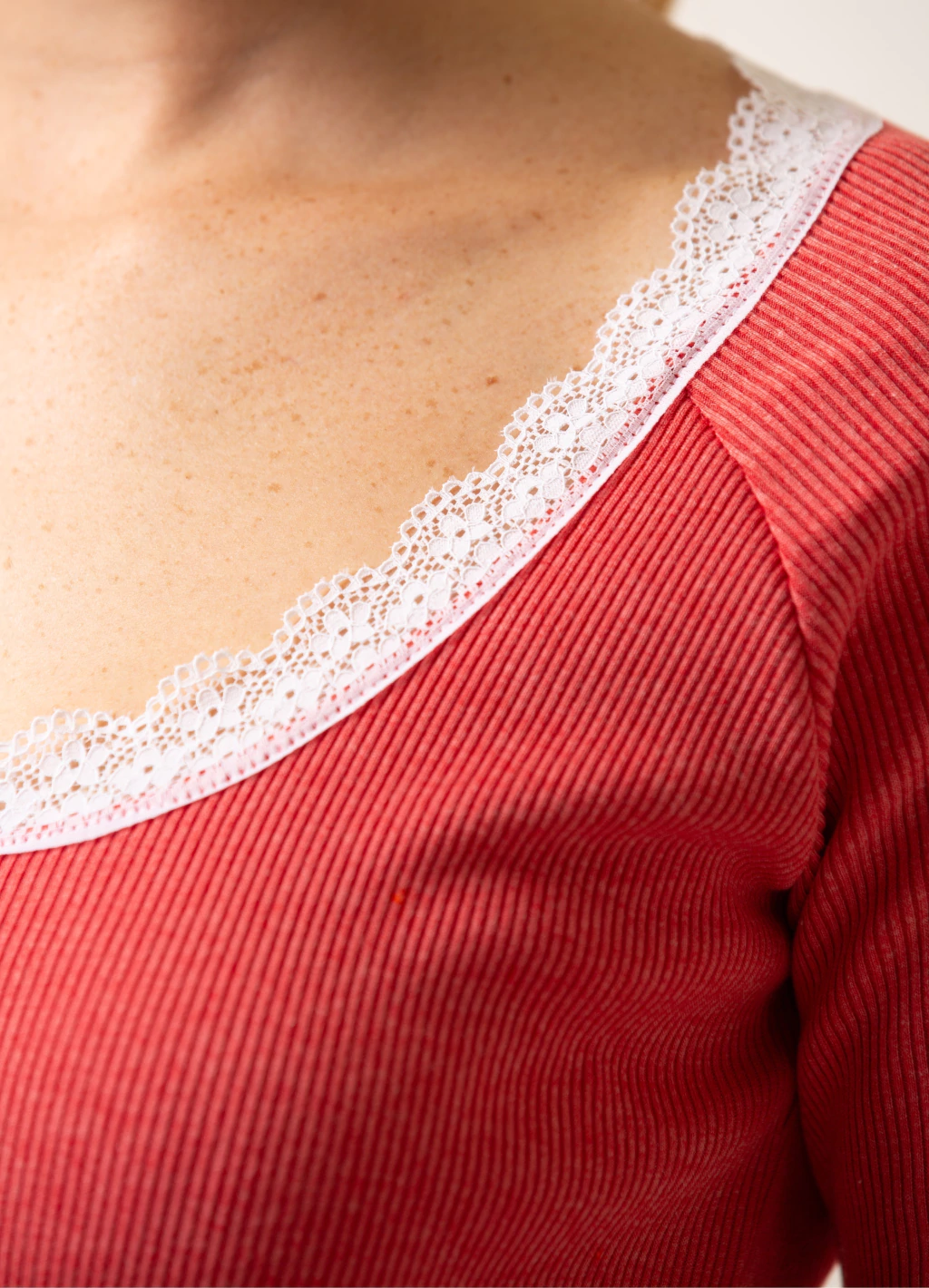 Su diseño resalta por el detalle de puntilla en el escote y una cartera con botones, brindando un toque distintivo y femenino.